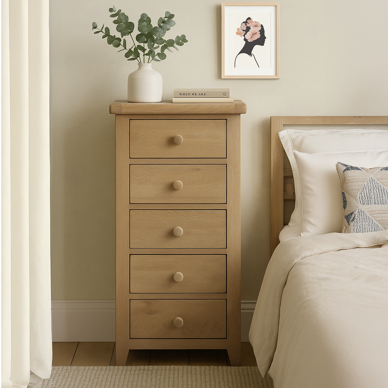 Inspired by traditional design, this tall chest of drawers combines practicality with timeless style, making it a wonderful addition to any family home. With five drawers crafted from solid oak, it provides the perfect balance of storage and elegance. Its slim shape makes it ideal for smaller spaces or as an extra storage piece in bedrooms or hallways. The chest also comes with two different styles of handles, giving you the freedom to change the look whenever you wish.