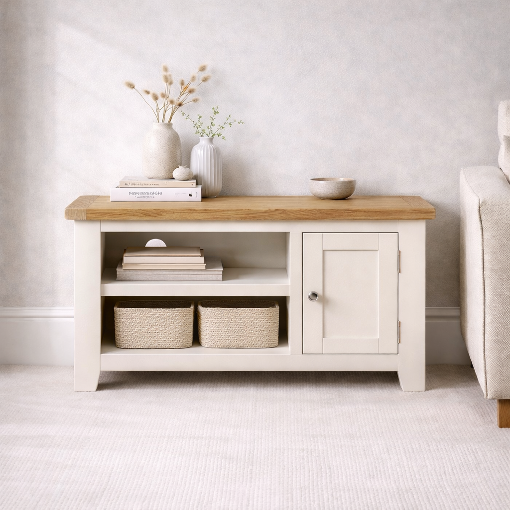 Nestling neatly in a corner where it can make the best use of space, you can still fit a TV on top of this beautifully crafted furniture. With a high quality oak top, and a frame that’s been painted a soft off white, it will fit seamlessly in your living room. There is also a dual shelf feature for that essential tech as well as a side cupboard with silver knob handle. Place this unit in a room that can’t live without having a TV in it, making it a haven for relaxation and deserved ‘me-time’.