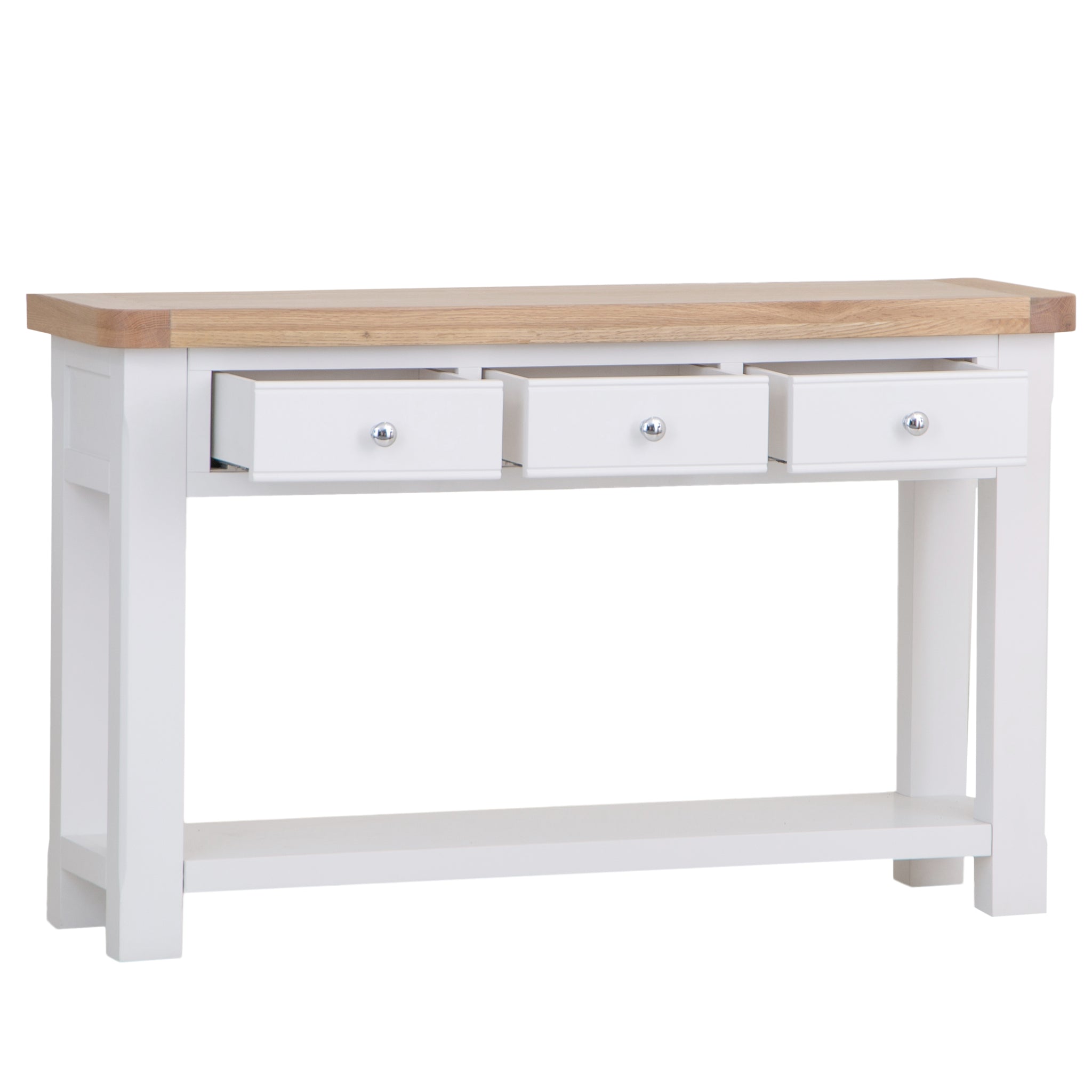 The Clover Painted Large Console Table is the perfect blend of practicality and style, bringing a touch of relaxed sophistication to your hallway, living room or dining space. With three drawers for keeping keys, post or other small essentials neatly tucked away, and a spacious lower shelf perfect for baskets, books or decorative pieces, this table combines charm with everyday usefulness.