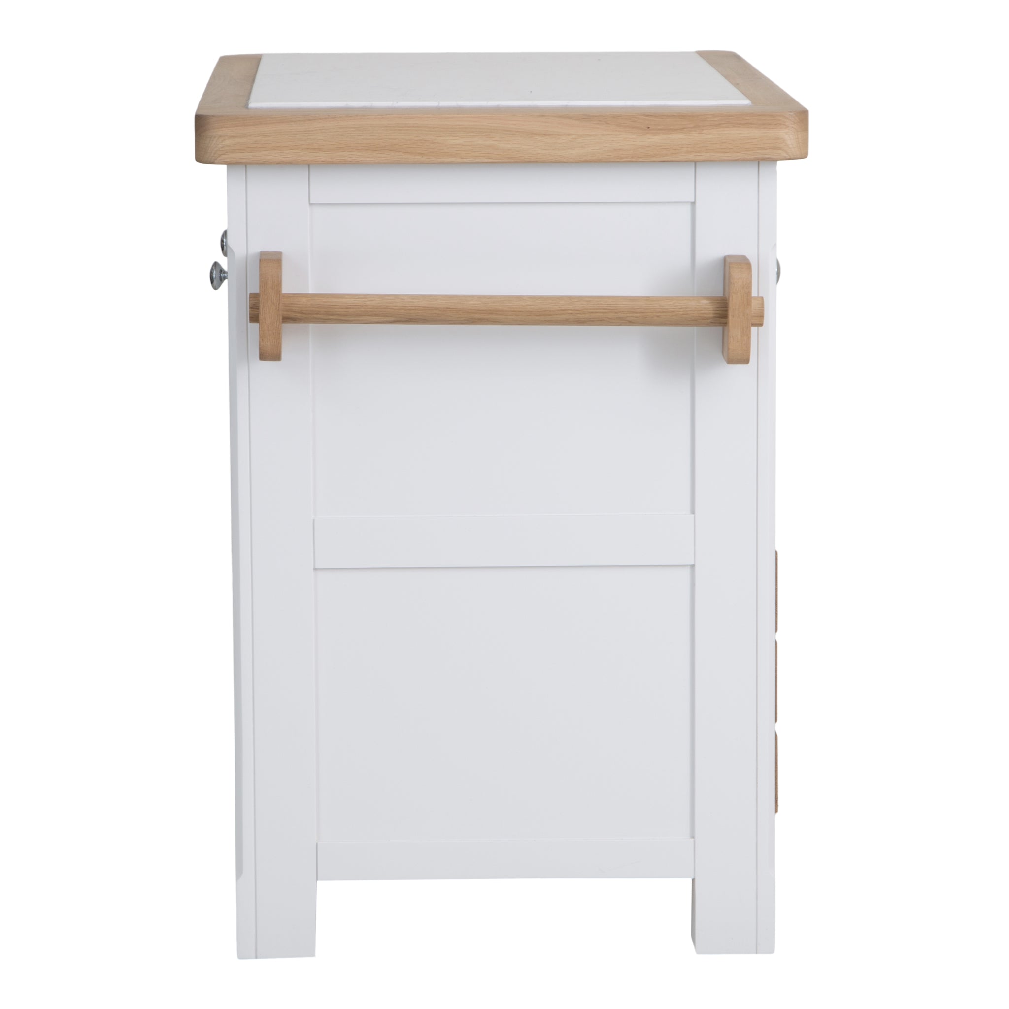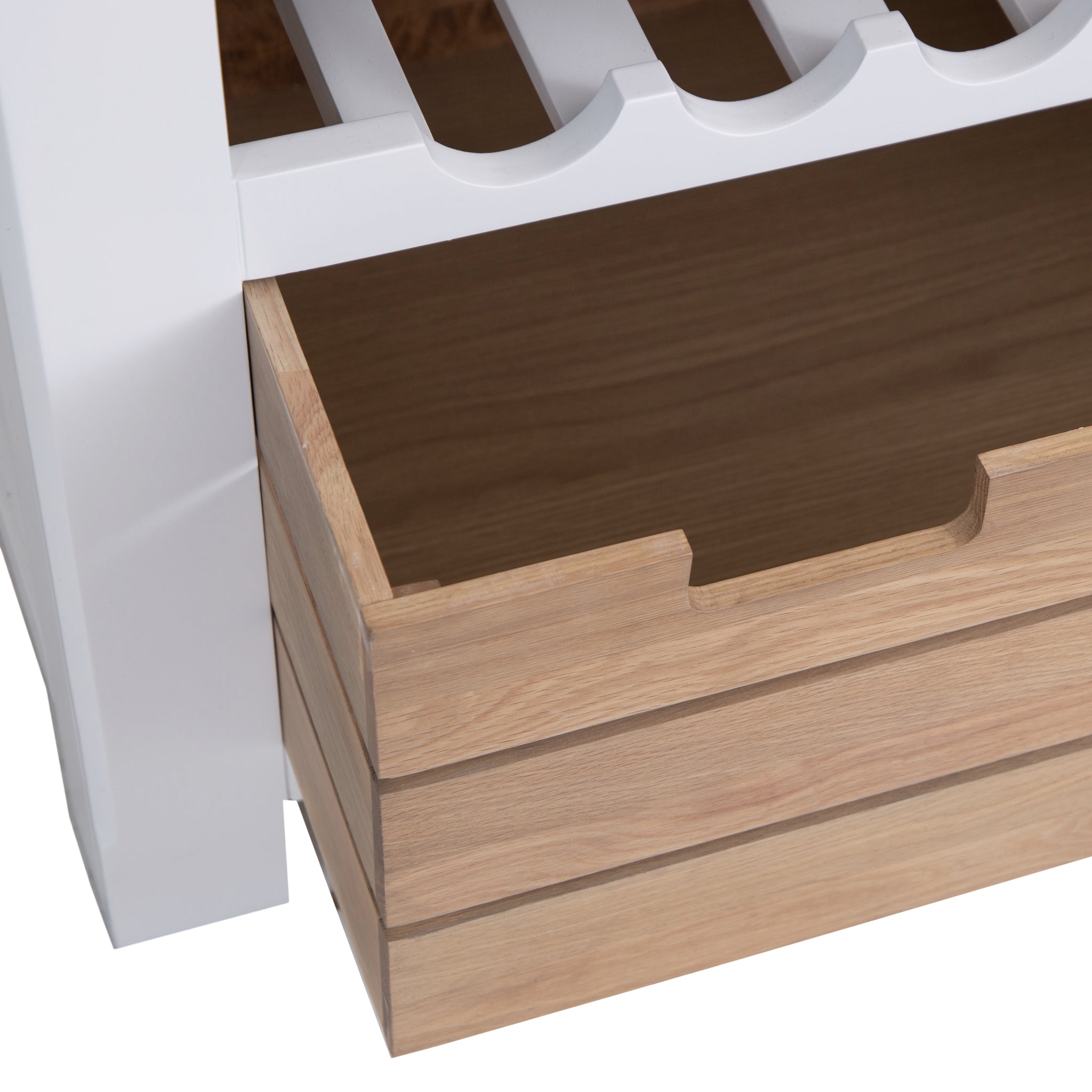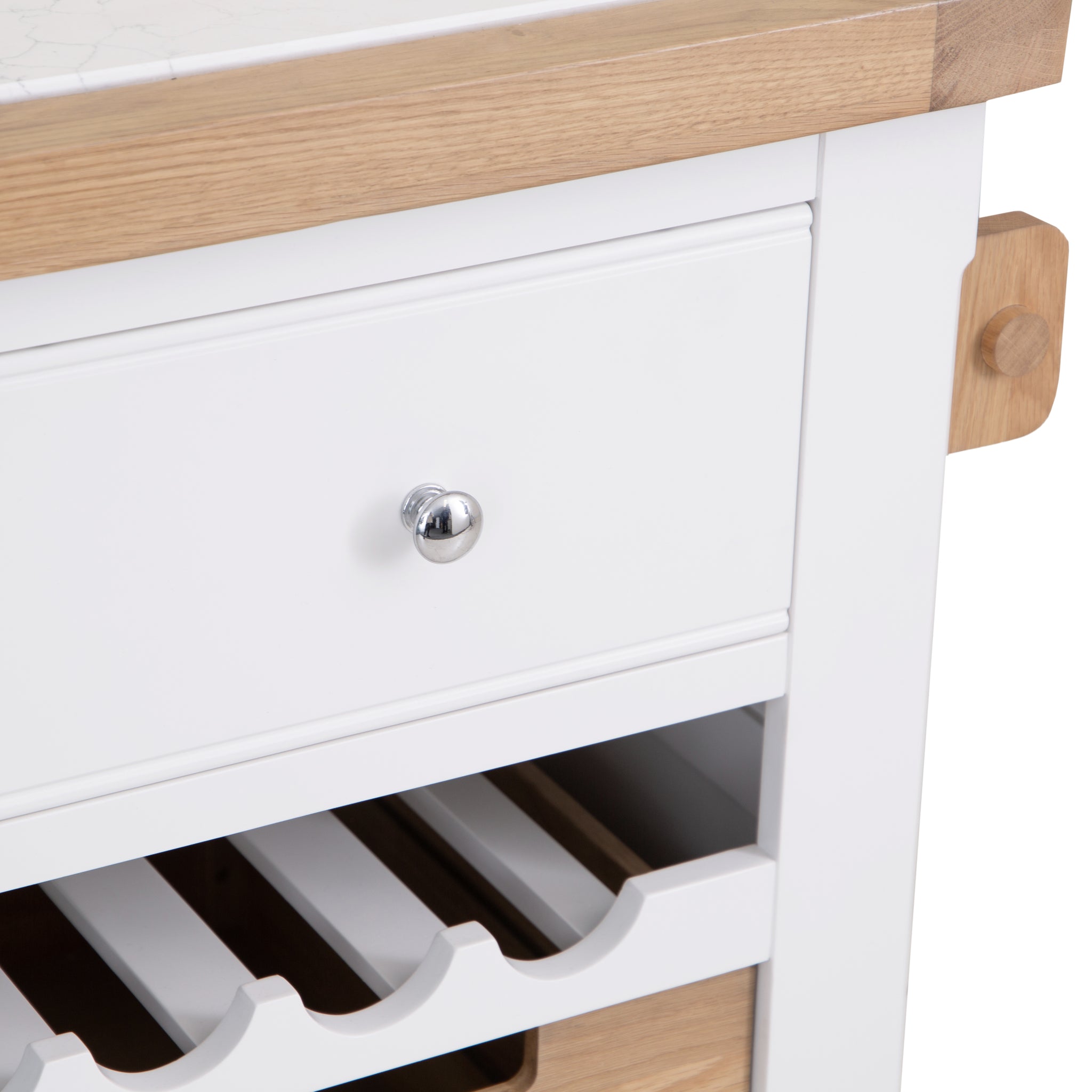 The combination of a soft white painted finish and a beautifully grained oak top gives it a calm, timeless look that works beautifully in both classic and modern settings. The solid surface provides the ideal spot for preparing food or serving drinks, while the drawer, open shelves and removable wooden crates keep everyday essentials close at hand. The built-in wine rack adds a touch of relaxed sophistication, ready for those moments when the kitchen becomes the gathering place.