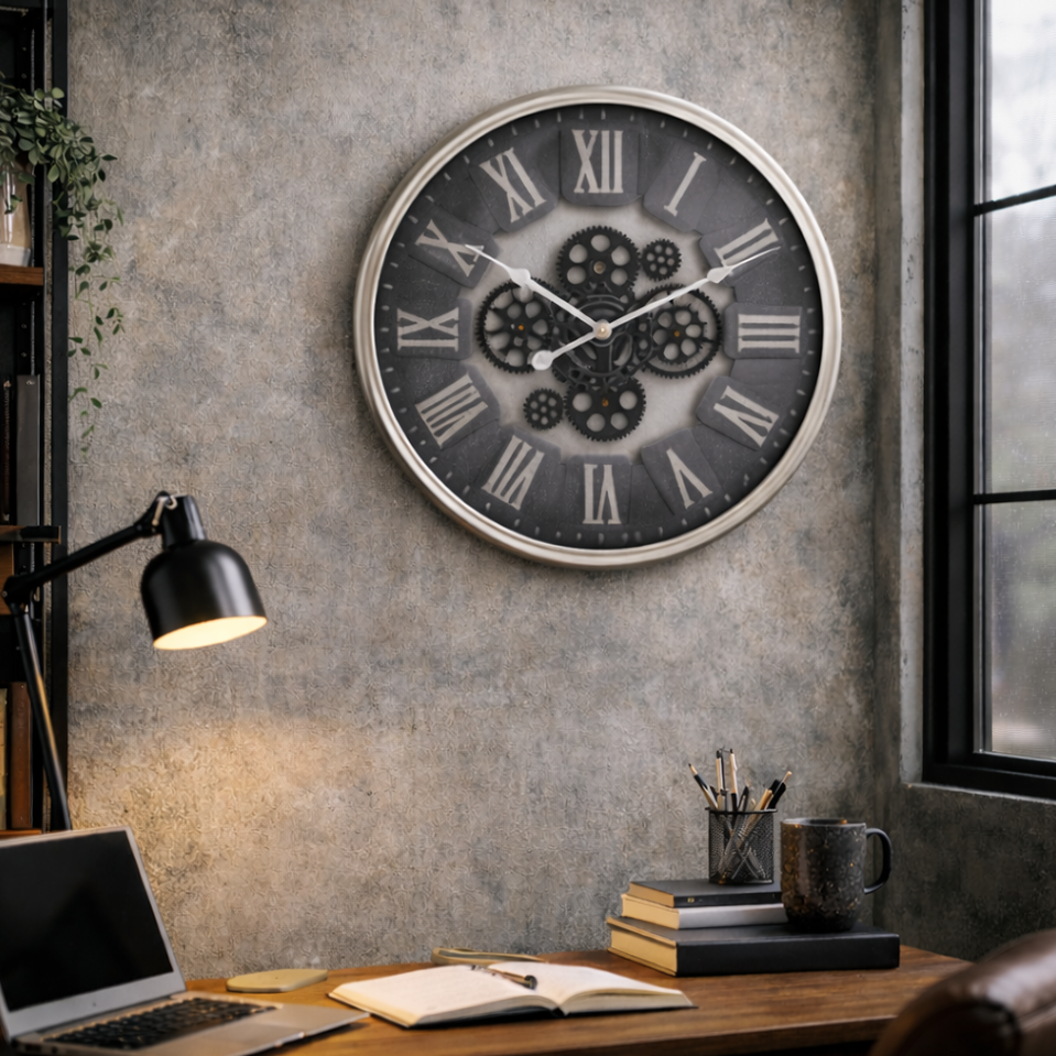 Clean and modern, this beautifully crafted wall clock puts popular in mechanics. The bespoke style provides a neutral aesthetic, while the visible inner mechanisms provide visual interest. The frame is made of metal with a clean matte metal finish. This clock has an exposed gear movement; thus, you can view the inner workings of the clock.
